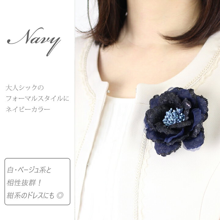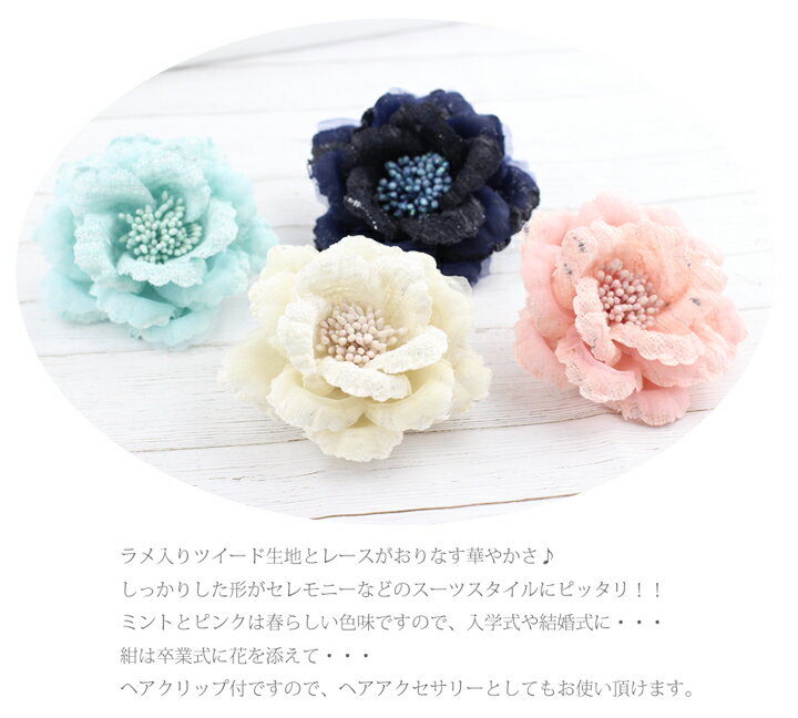 しっかりした形がセレモニーなどのスーツスタイルにピッタリ!! ミントとピンクは春らしい色味ですので、入学式や結婚式に・・・ 紺は卒業式に花を添えて・・・ ヘアクリップ付ですので、ヘアアクセサリーとしてもお使い頂けます。